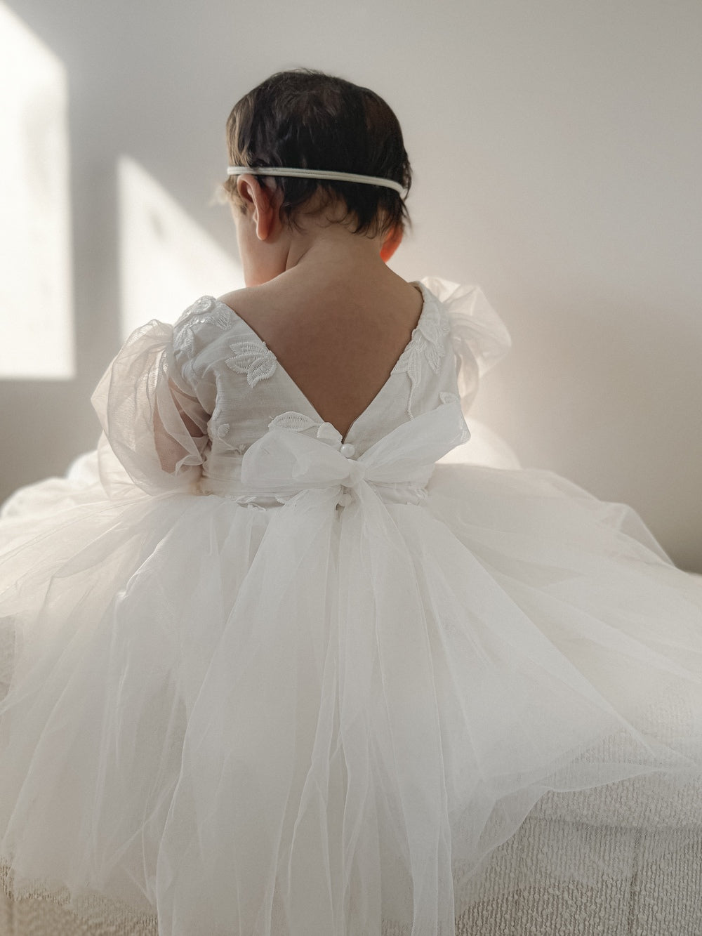 The Alyssa Baby Dress Romper is a timeless piece crafted for life’s most cherished occasions. With its elegant puffed long sleeves, V-back detail, and delicate silhouette, this beautiful white baby romper dress is perfect for weddings, christenings, baptisms, and formal celebrations.