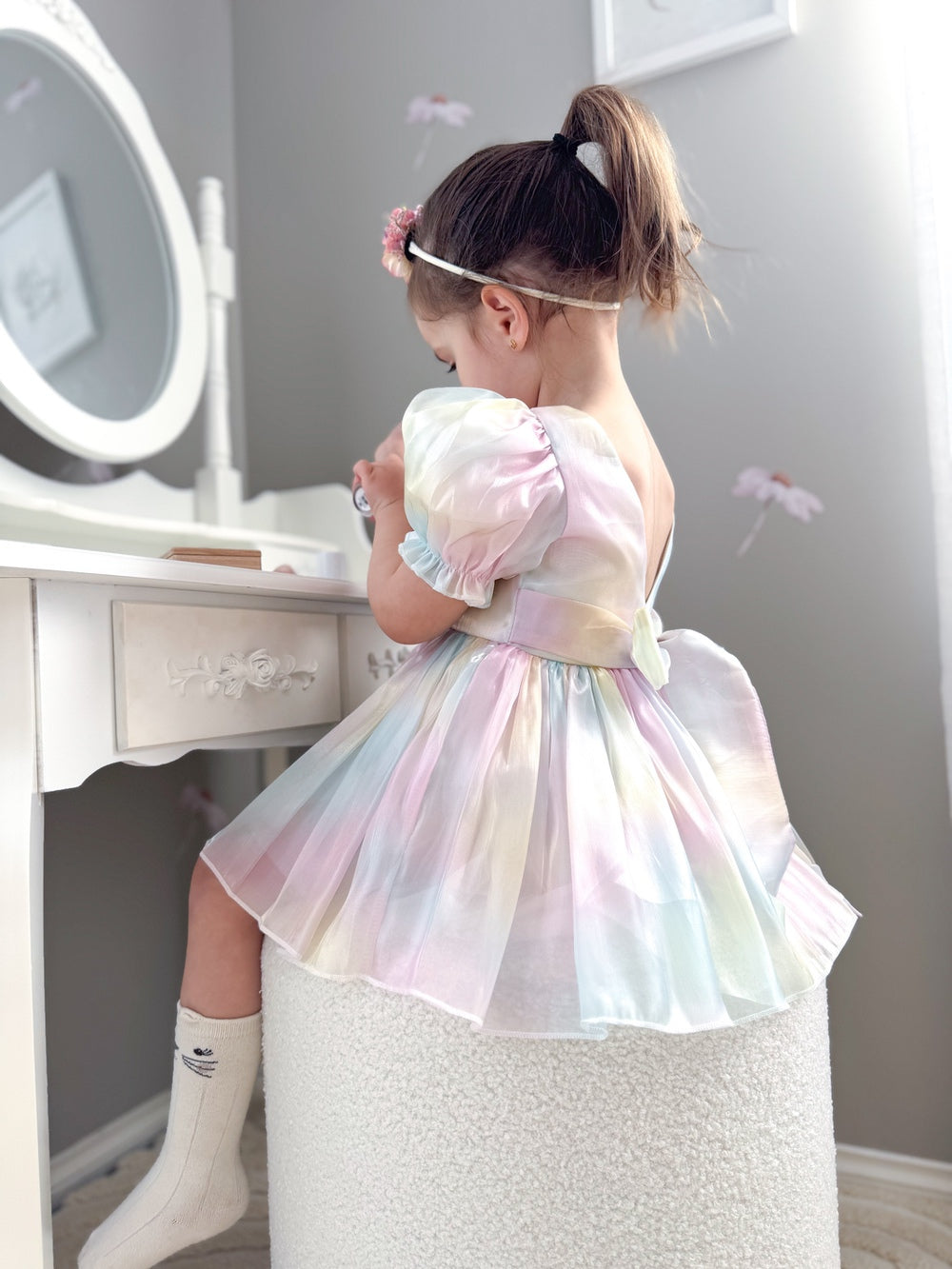 The Anastasia Dress for girls aged 2–8 is made for moments filled with colour and joy. From unicorn-themed birthdays to mermaid parties, this knee-length rainbow dress captures the magic of childhood with its soft shimmer, playful puff sleeves, and dreamy silhouette.