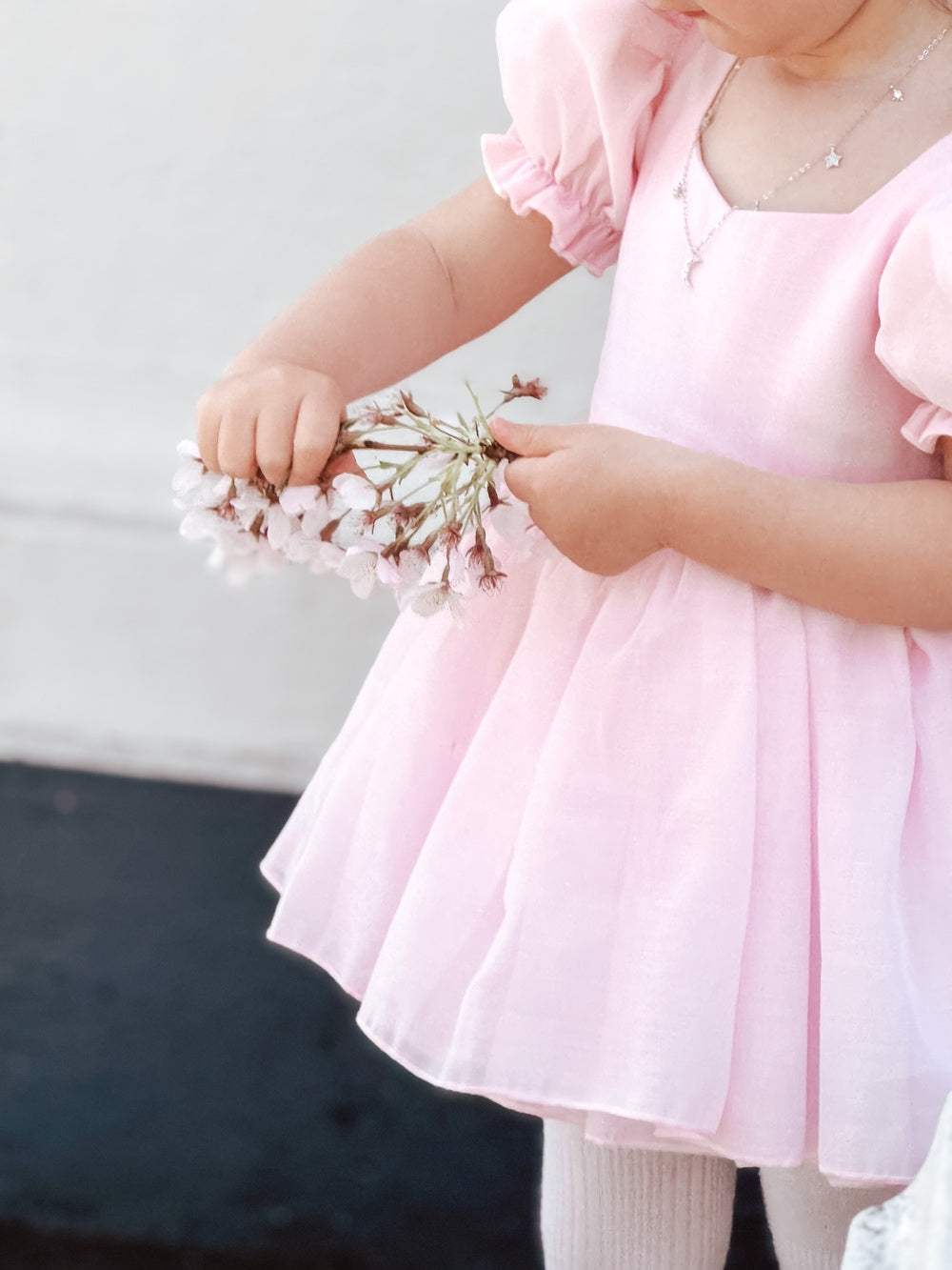 Dress her up in sweetness with the Arabella Baby Pink Dress Romper - a soft, delicate outfit that brings all the charm of a dress in baby‑friendly form. With puff sleeves, a gentle shimmer overlay, and a signature bow on the back, this romper feels like a special girls baby dress she’ll look adorable in.