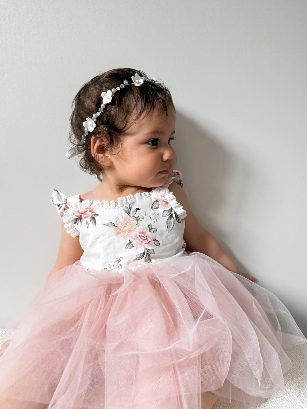 A beautiful romper for your baby girl’s special occasions, the Aria Tulle Baby Romper in Dusty Pink combines timeless elegance with everyday comfort. The bodice features a delicate floral print of soft pink and beige tones on a white background, paired with a floaty dusty pink tulle skirt that adds a touch of magic to every moment.
