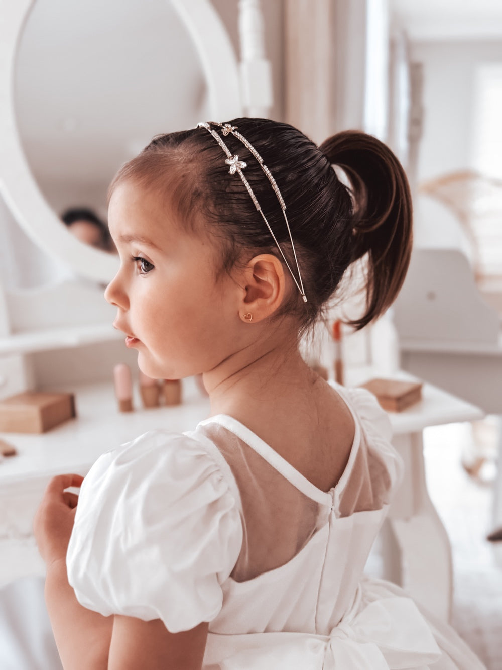 Adorned with shimmering diamantes and elegant butterfly details, it catches the light beautifully from every angle, adding a magical touch to her hairstyle. Whether paired with a flower girl dress, party outfit, or formal gown, it’s the perfect finishing piece for a look that shines.
