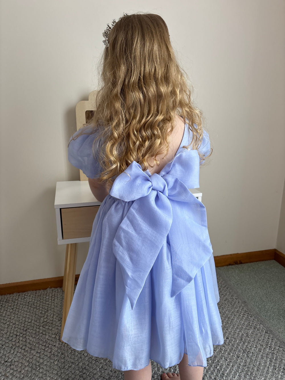 Featuring adorable puffed sleeves and a classic below-knee cut, your girls will be delighted to wear this dress with sophistication and youthful charm. The highlight of the Delia dress is the stunning V back adorned with a large bow that ties gracefully at the back.