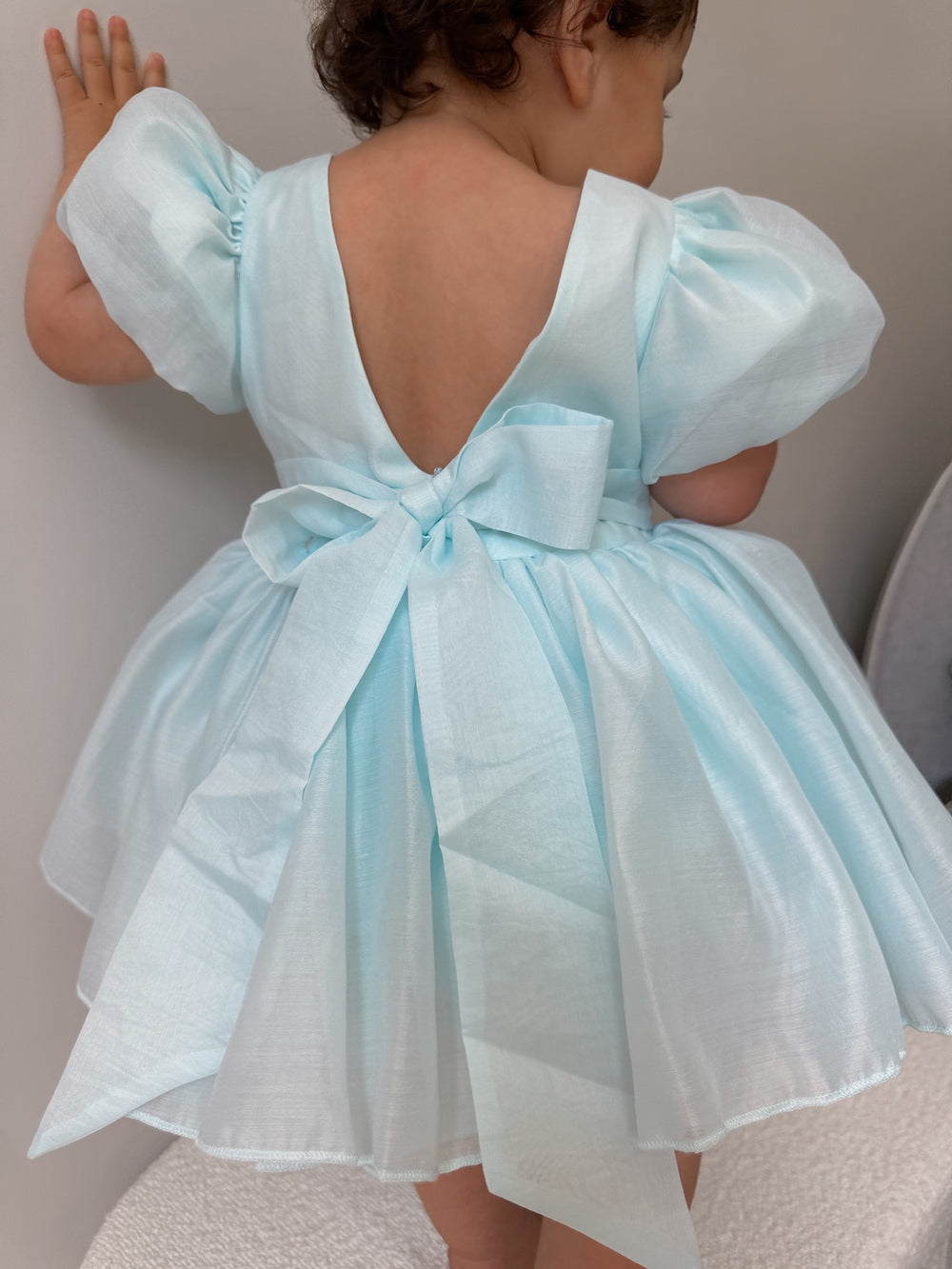 The sweetest baby girls’ party dress in pale blue - perfect for matching flower girls, birthdays, weddings, and magical first birthday celebrations.
