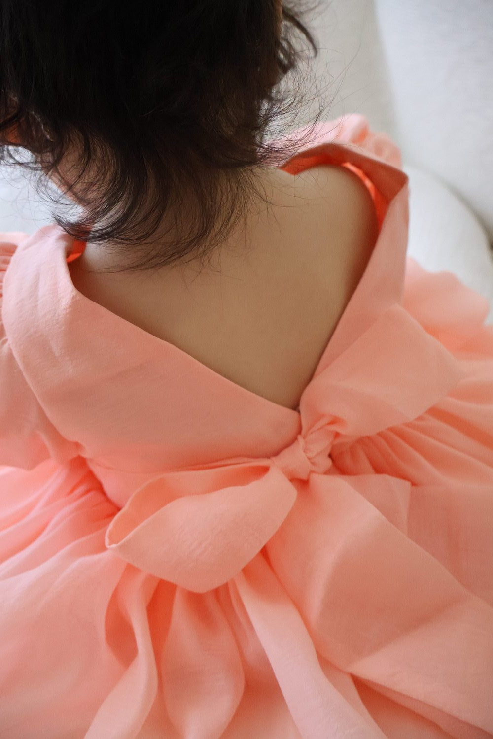 Designed with adorable puff sleeves and a stunning V-back finished with a sweet bow, this peach baby dress mirrors the elegance of our Delia Girls Peach Dress — perfect for matching sister photos. The gentle shimmer in the fabric adds a magical touch, while the floaty skirt invites twirls, cuddles, and camera-ready moments.