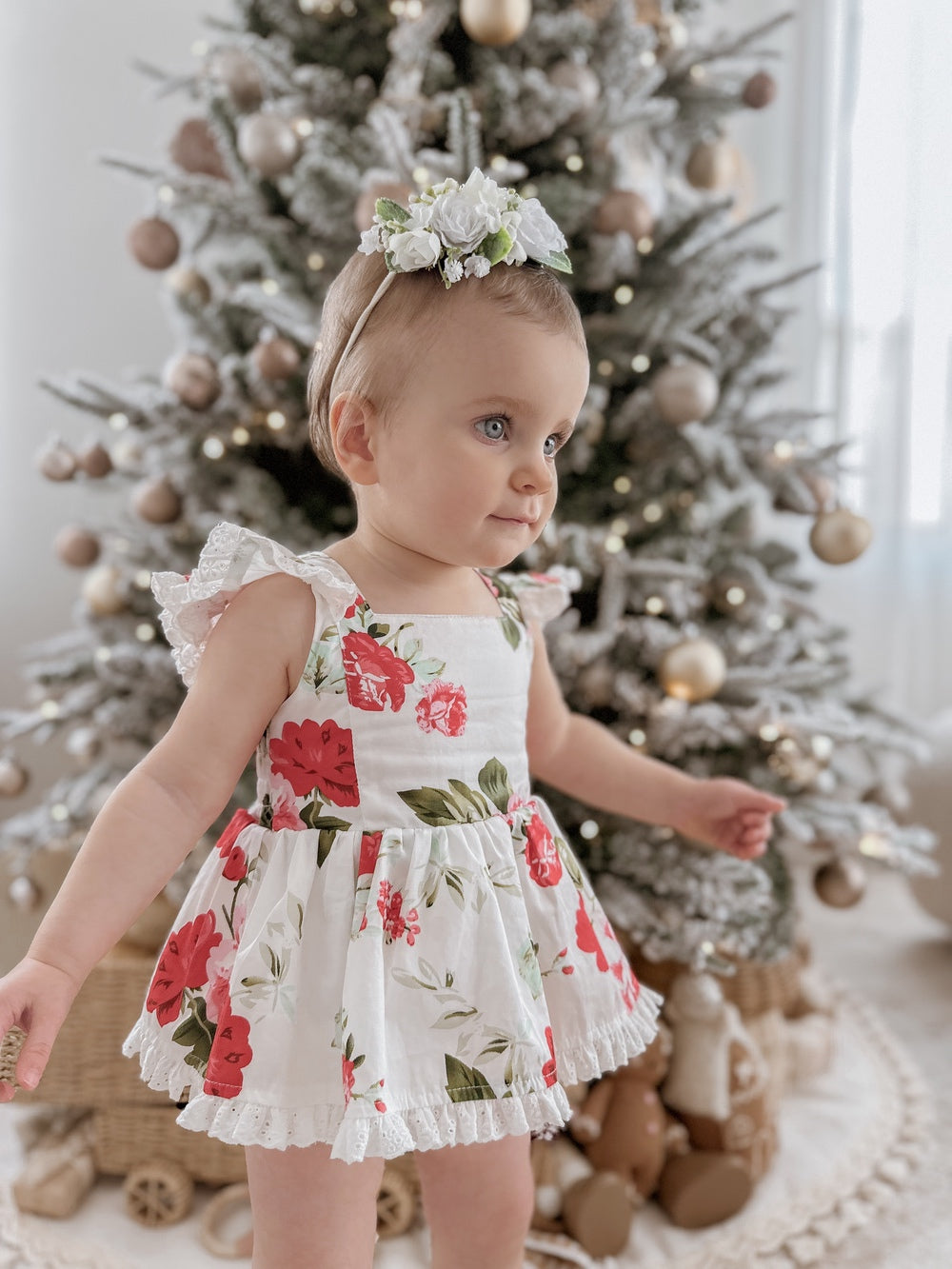Dress your little one in timeless Christmas charm with the Faith Baby Girls Floral Christmas Romper. Featuring a classic white background with soft red and green florals, this adorable romper captures the magic of the season while keeping your baby comfortable all day long.