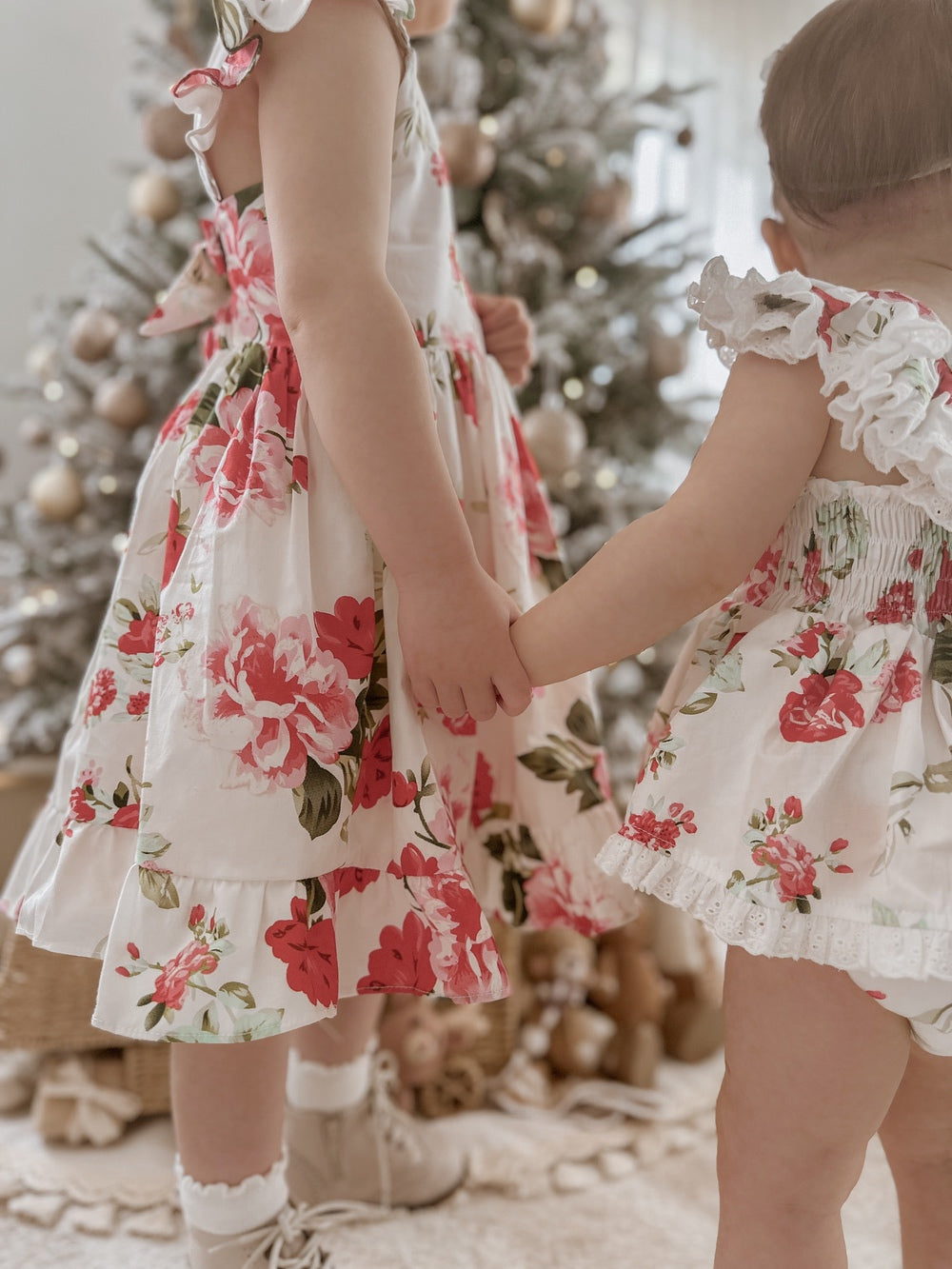 Made from 100% breathable cotton, it’s gentle on delicate skin and perfect for warm festive days. The broderie anglaise frills along the straps and ruffles add a traditional touch, beautiful for family photos or Christmas gatherings.
