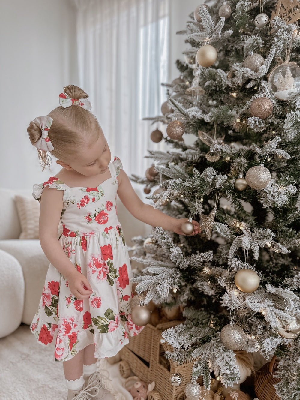 Crafted from the same beautiful festive floral fabric featuring red and green blooms on a white base, these bows tie the whole outfit together with classic holiday charm. Each bow is securely attached to an alligator clip, making them easy to pop into pigtails or use as accent clips for other hairstyles.