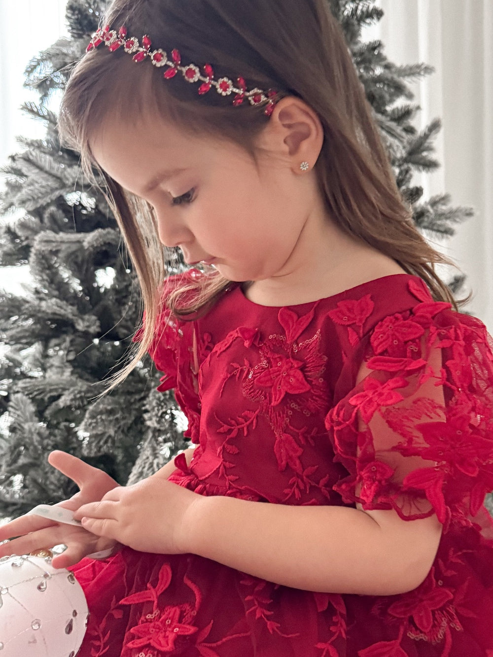Make her Christmas outfit shine with the Fleur Red Crystal Christmas Headband – a beautiful alternative to a full flower crown. This flexible halo-style headpiece is adorned with radiant red crystals, making it the perfect festive finishing touch for girls attending Christmas events, pageants, or special family gatherings.
