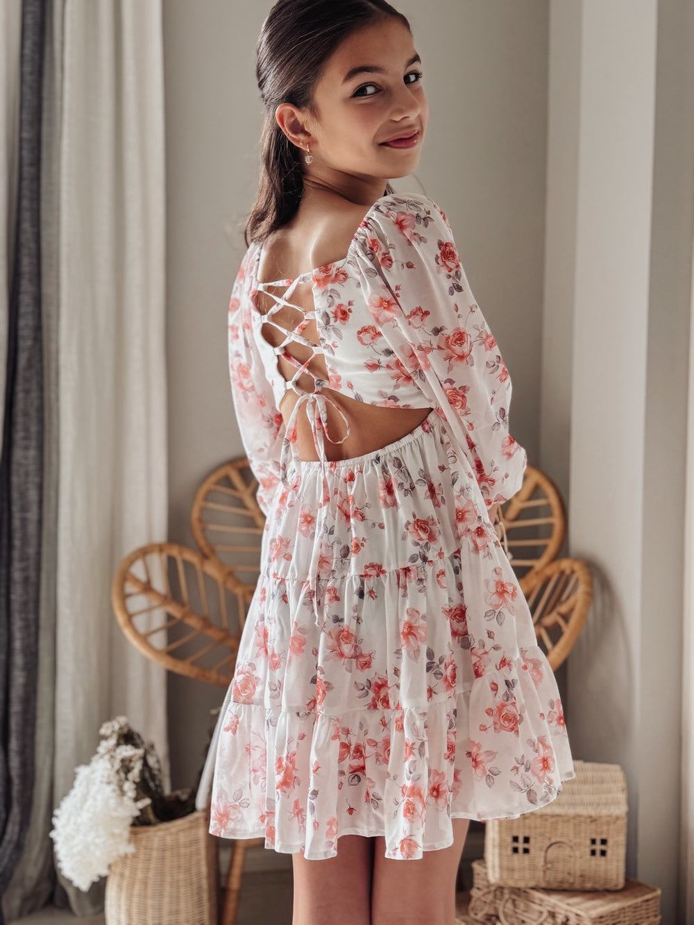 With a stunning lace-up back, long sheer sleeves, and a dreamy sweetheart neckline, this design feels like it’s stepped straight out of a storybook. The tiered skirt adds a playful twirl-worthy charm, while the soft 100% cotton lining ensures all-day comfort.