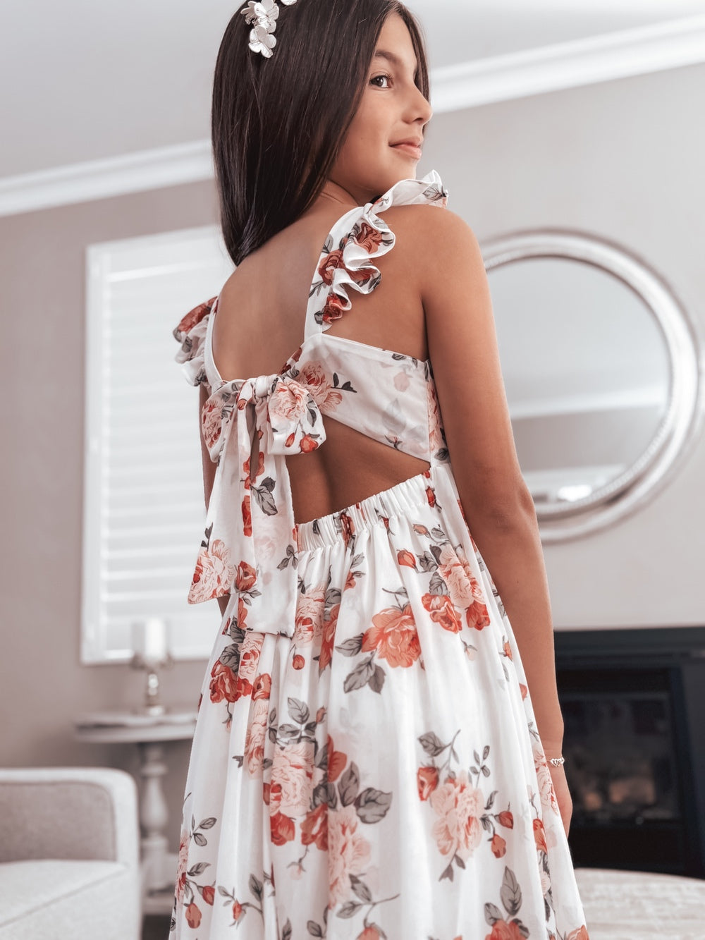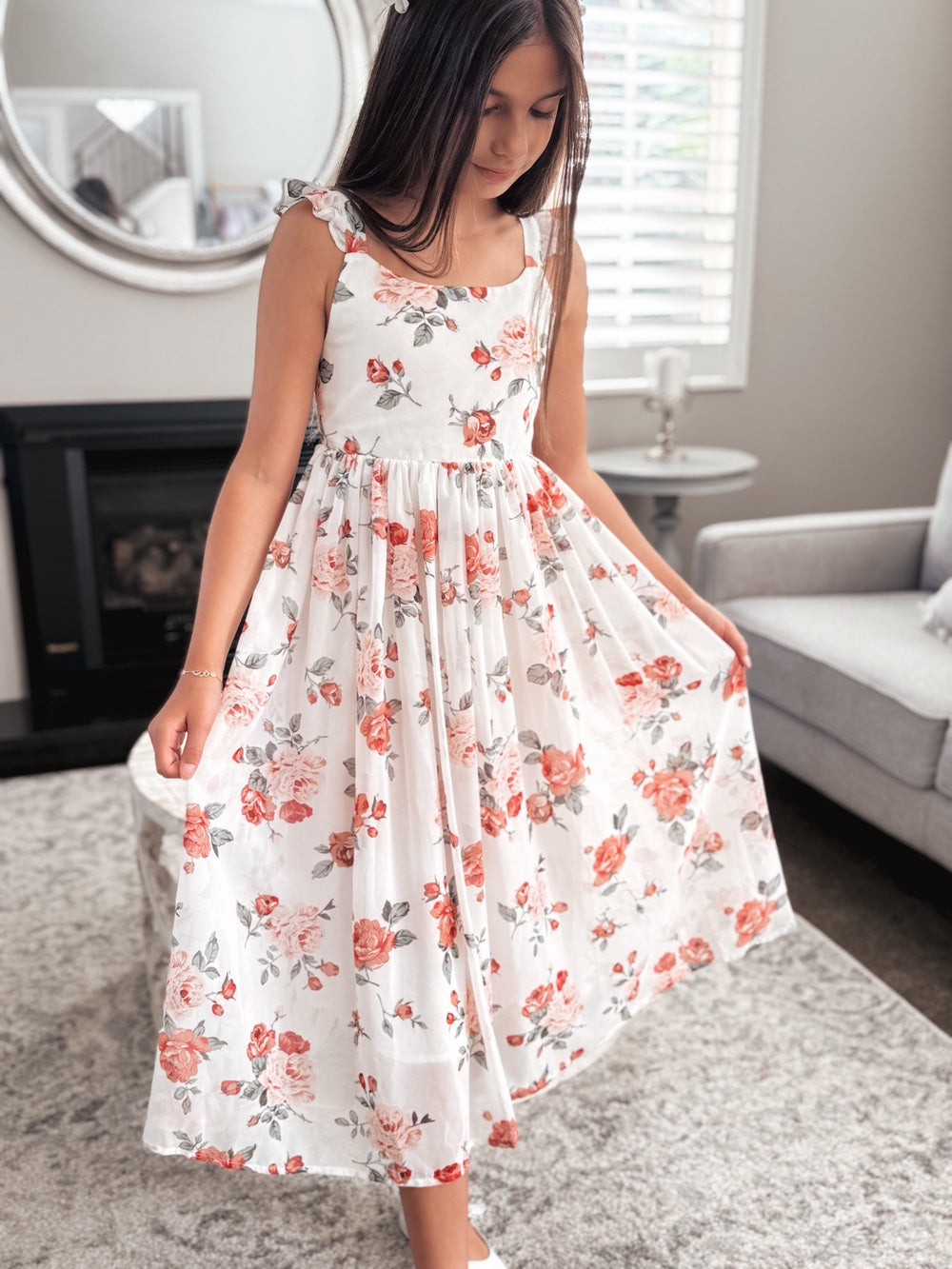 The Leilani Girls Floral Dress, now in a white base with pink and red rose patterns, offers refined style with playful charm. Its lightweight chiffon fabric and graceful tea-length skirt give her freedom to twirl, dance, and shine at weddings, family gatherings, photoshoots, or any elegant event.