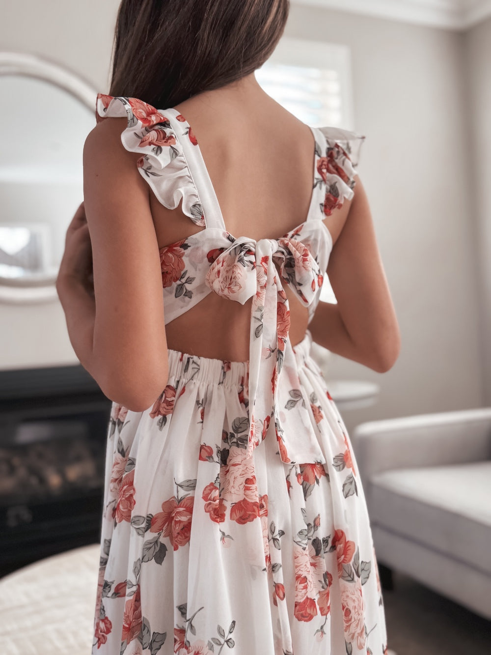 Delicate ruffle shoulders enhance the romantic feel, while the tie-up back adds both adjustability and sweet detail. An elasticated waist ensures a flattering yet comfortable fit, and the flowing fabric moves fluidly with every step.