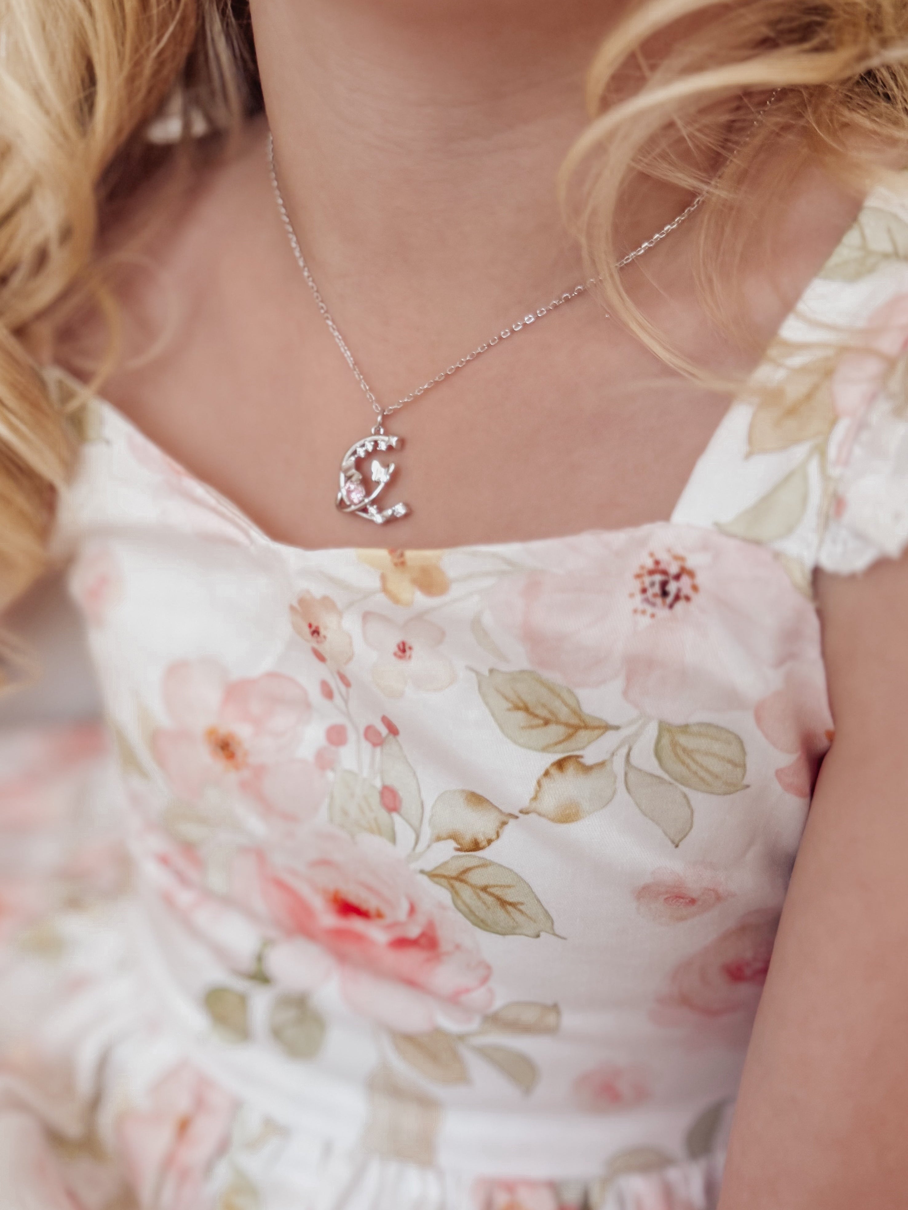 The Moonbeam Sparkle Girls Silver Necklace is a celestial-inspired piece designed to celebrate her inner light. With a delicate crescent moon and circular design, this enchanting girls necklace features two butterflies and a star dancing around a soft pink gemstone at the centre – a beautiful symbol of wonder, imagination and growth.