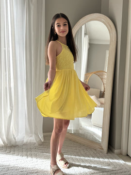 The Norah Dress is a cheerful above-the-knee graduation style designed for confident twirls and lasting memories. With its soft chiffon skirt and delicate lace bodice, this Year 6 graduation dress balances elegance with fun in a beautiful yellow hue that captures the joy of the occasion.