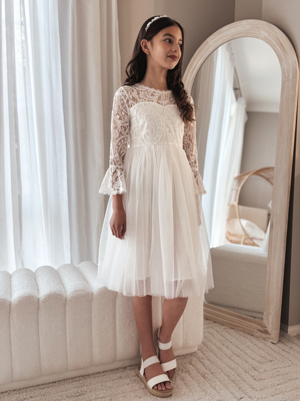 The Odette Girls White Dress is a beautiful knee-length style designed to bring timeless elegance to weddings, christenings, and special events. Featuring a delicate lace bodice with soft 3/4 bell sleeves and a fairytale-like tulle skirt, this white flower girl dress is perfect for little ones making their grand entrance.