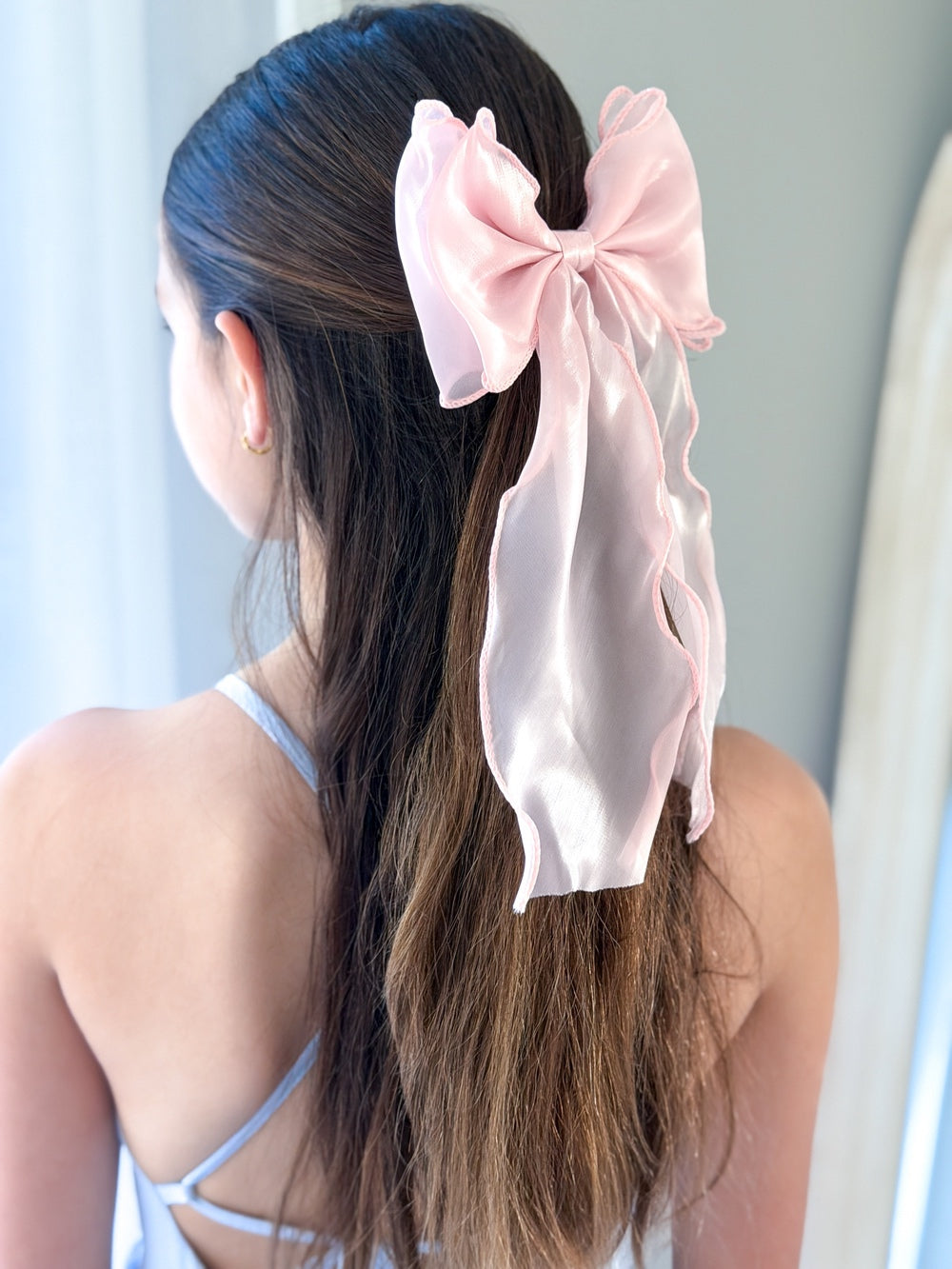 Whether she’s dressing up for a wedding, posing for family photos, or simply adding a touch of charm to her day, this light pink organza bow is a versatile favourite she’ll reach for again and again.