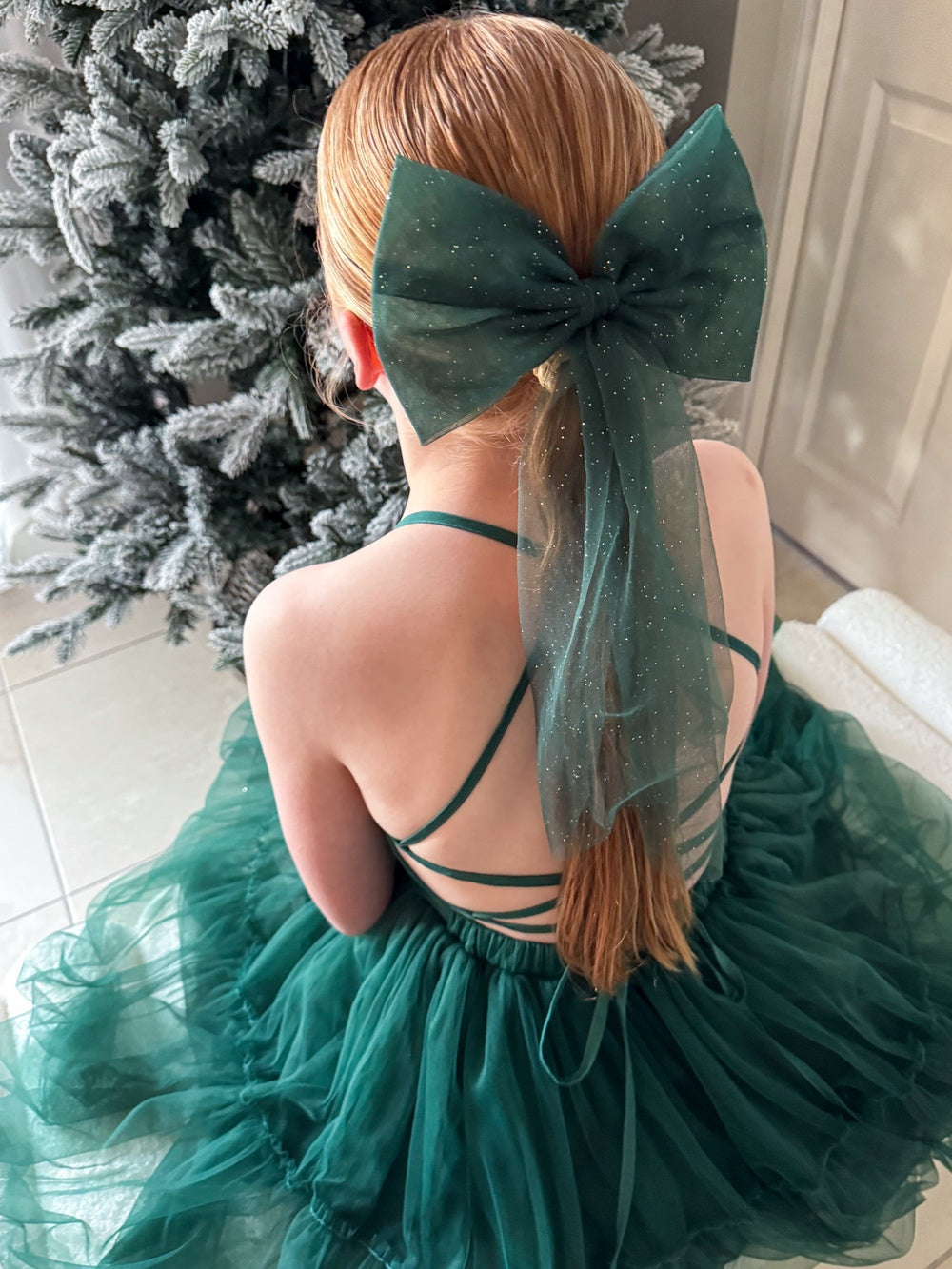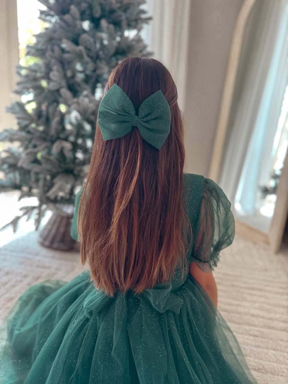 Add a gorgeous green sparkle tulle bow to complete the perfect Christmas outfit for your Santa photos this year. This bow matches perfectly with our Nina Sparkle Dress and Baby Romper and our Lotus Dress and Baby Romper