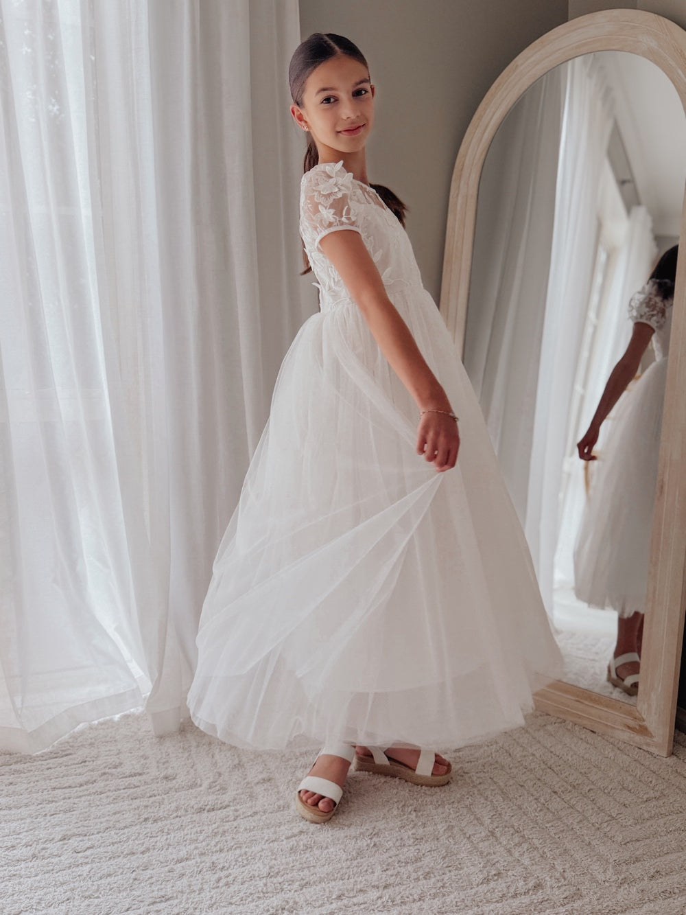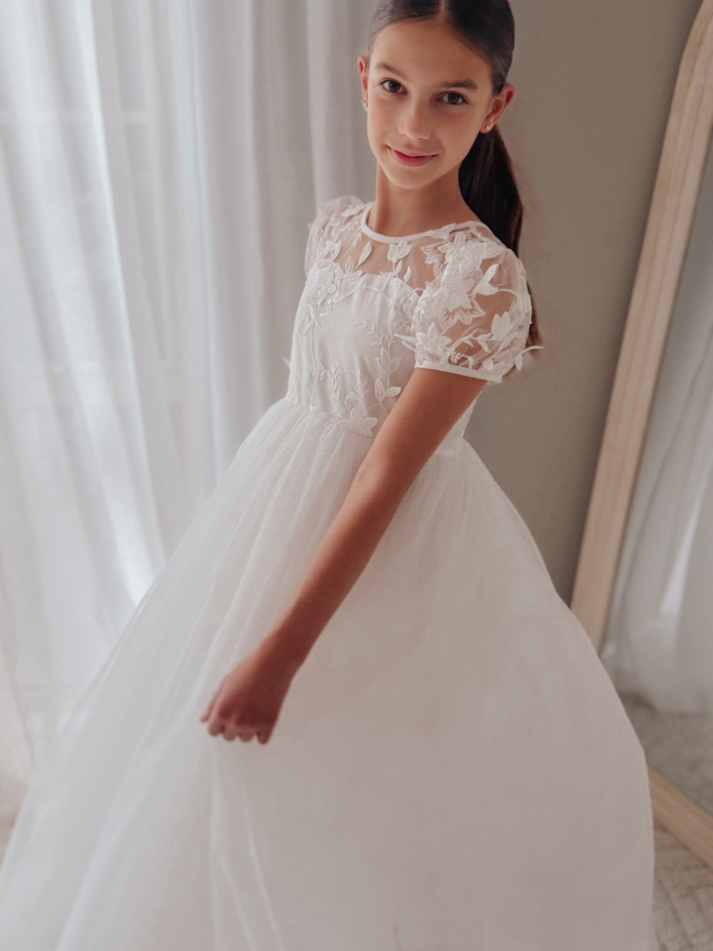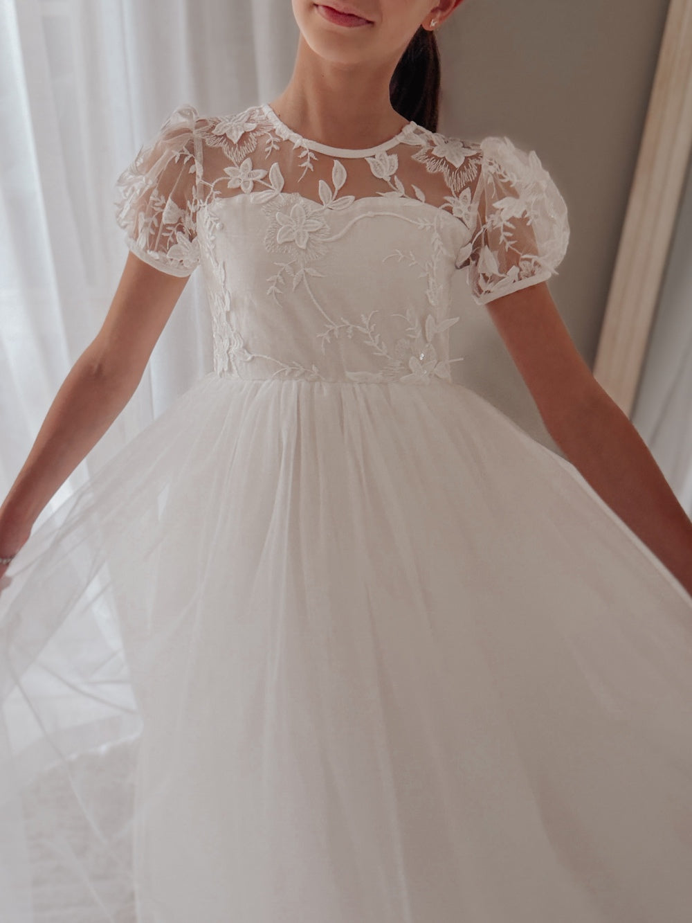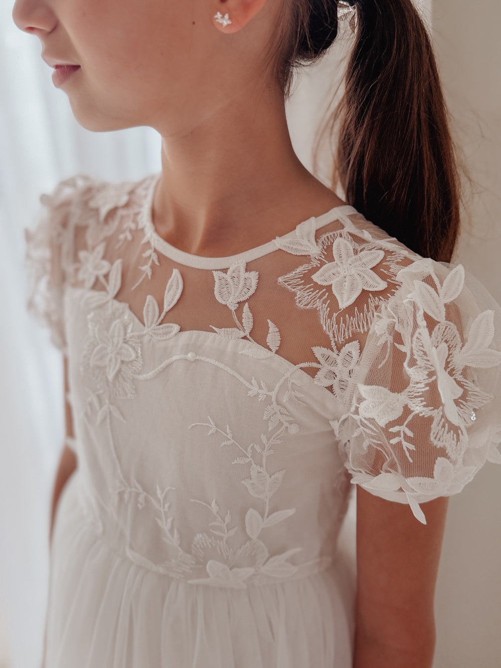 Victoria is a full-length white dress designed for the occasions you’ll remember forever, it makes a beautiful girls white Communion dress for ceremony days and keepsake photos. The bodice features delicate floral embroidery with a sheer embroidered yoke, creating a refined, photo-ready look that still feels soft and age-appropriate.