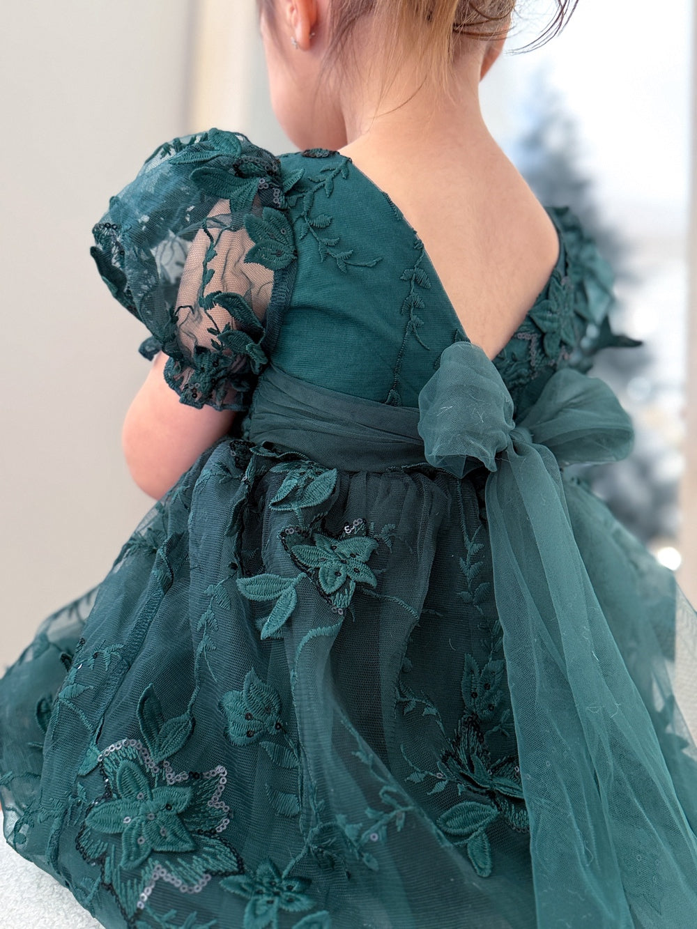 Introducing our stunning Vienna Girls Green 3D Embroidery Dress – the perfect choice for a celebration or a stunning flower girl dress! Adorned with intricate floral embroidery on the puff sleeves, bodice, and skirt, adding a touch of elegance to your little one's ensemble. The vibrant green hue and large tulle bow makes a stunning girls Christmas dress.