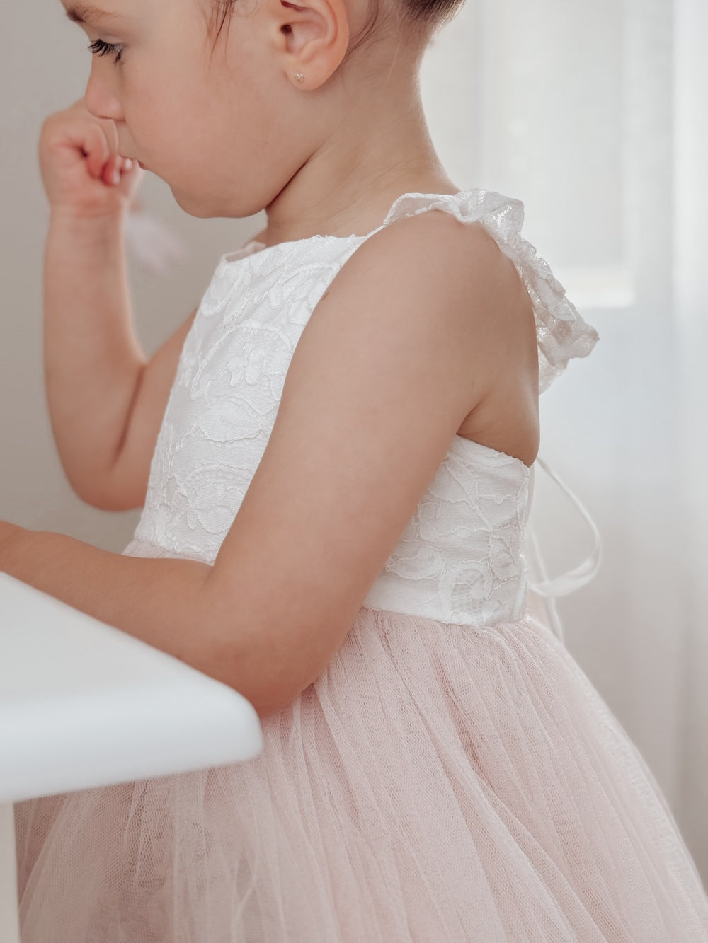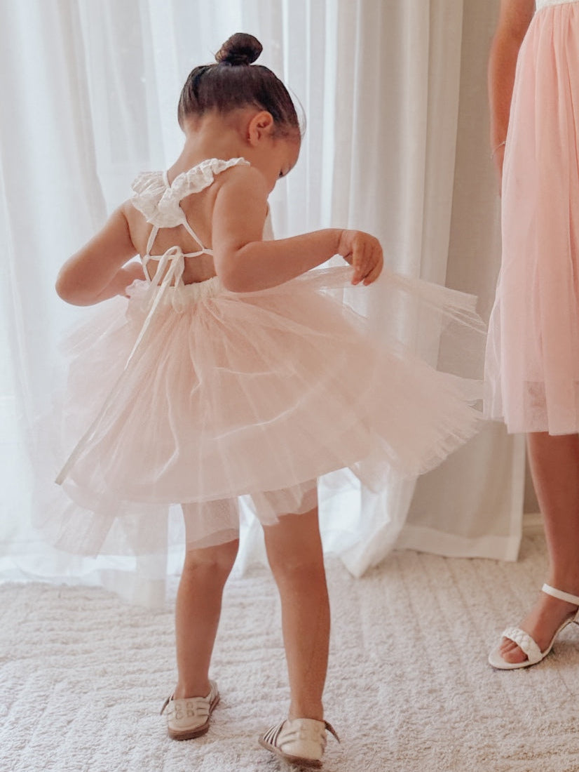 Soft, elegant and designed with twirls in mind, the Zara Dress is a beautiful choice for special occasions. With a stunning white lace bodice and a soft peach tulle skirt, it’s a timeless style for celebrations, photos and holiday moments.